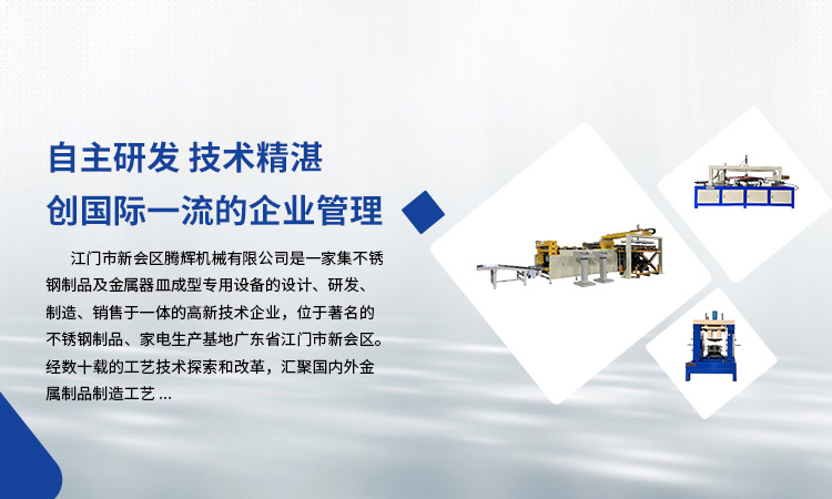 江門市新會區騰輝機械有限公司是一家集不銹鋼制品及金屬器皿成型專用設備的設計、研發、制造、銷售于一體的高新技術企業,位于著名的不銹鋼制品、家電生產基地廣東省江門市新會區。經數十載的工藝技術探索和改革,匯聚國內外金屬制品制造工藝。